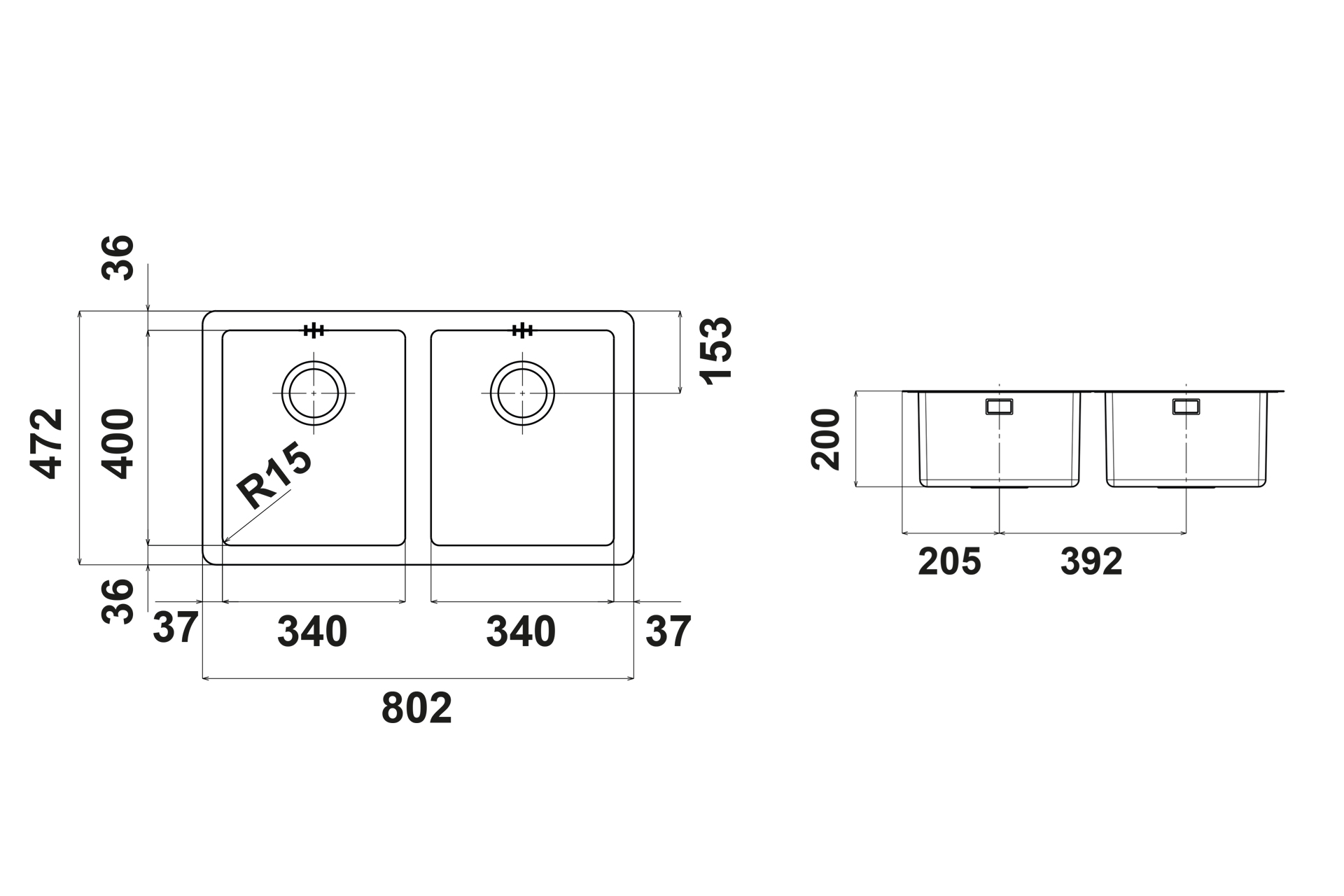 Cuve SEGMA 3434, matière Inox lisse, 2 cuves, livré avec vidage manuel et siphon, équipée d’une bonde design.