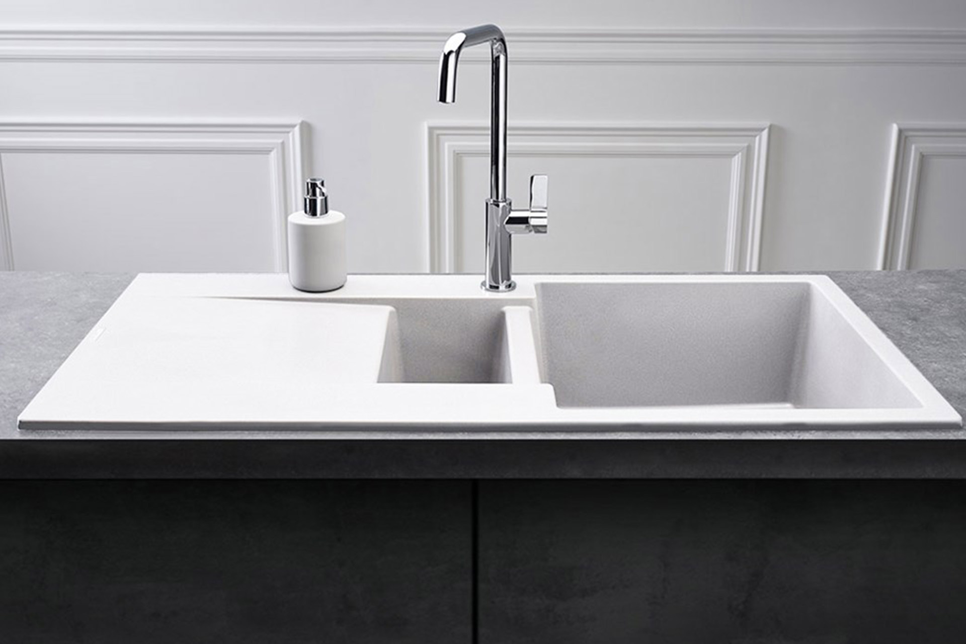 La collection AMELIA est composée d’évier aux lignes épurées et au large choix de couleurs. L’évier AMELIA 15 est réversible et s’installe sur un sous-évier de 80. L’évier à la particularité d’avoir une mini-cuve ou appelé aussi « vide sauce », qui s’écoule librement dans la cuve principale. Les deux cuves sont équipées d’une bonde design, ce détail donne un aspect haut de gamme. Découvrez l’ensemble des éviers AMELIA et retrouvez cette collection dans un choix de packs évier-mitigeur, dans notre catalogue catalogue L’Essentiel de la cuisine