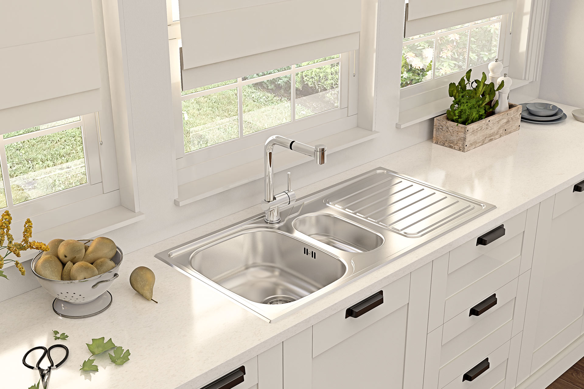 La collection LETO est classique et économique. L’évier LETO 15 est réversible et s’installe sur un sous-évier de 60. Il possède deux cuves dont un vide sauce, cette disposition simplifie les usages quotidiens. L’évier est livré avec un vidage manuel. Cet évier est idéal pour un petit budget ou une cuisine dans un bien en location. Découvrez l’ensemble des LETO et retrouvez cette collection dans un choix de packs évier-mitigeur, dans notre catalogue L’Essentiel de la cuisine