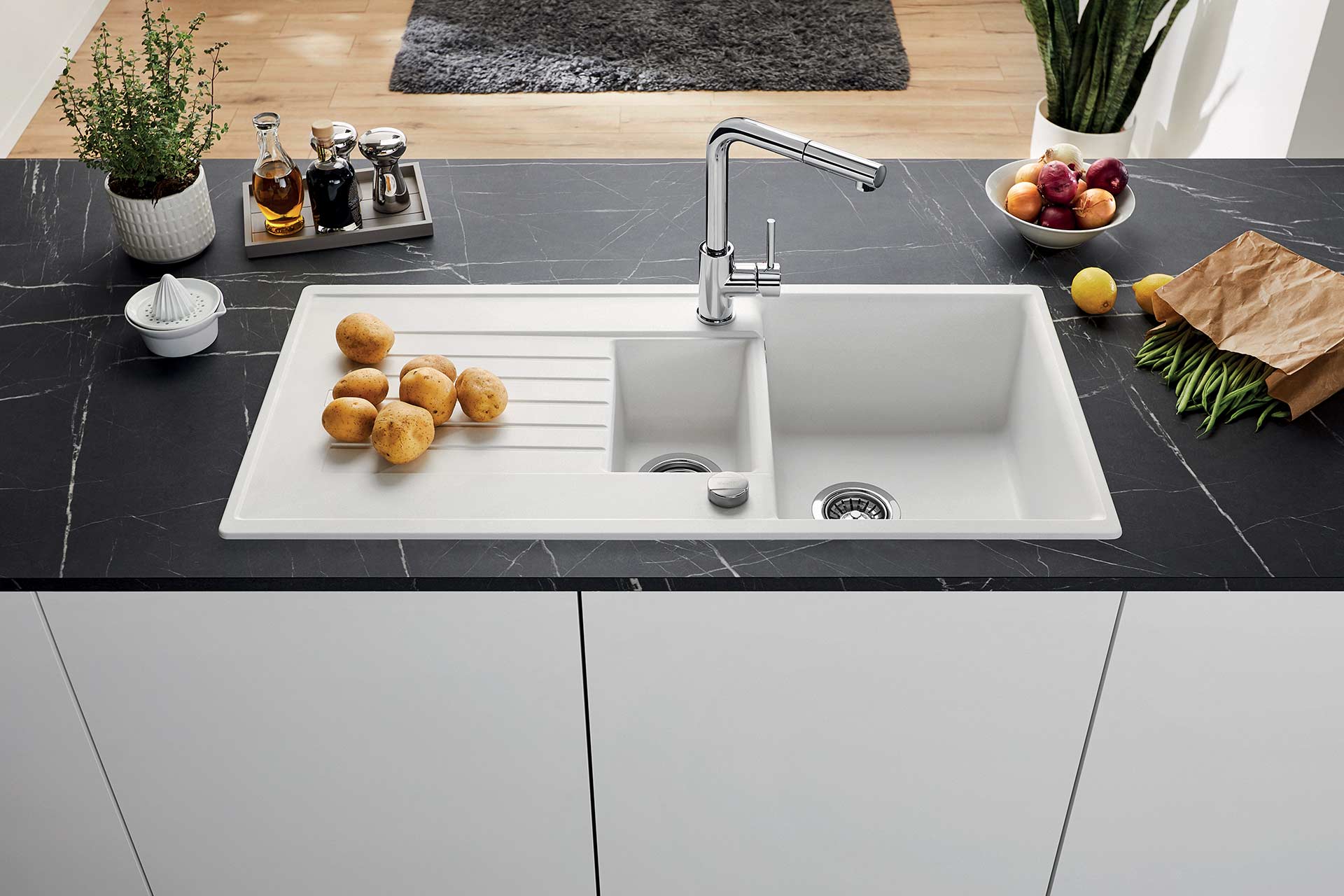 La collection SANTARA est composée d’un large choix de taille d’éviers et de choix de coloris. Fabriquée par notre partenaire allemand BLANCO®, la collection SANTARA est notre bestseller. L’évier SANTARA 15 s’installe dans un sous évier de 60. Cet évier plait par son confort d’utilisation grâce à sa cuve petite cuve complémentaire. Découvrez l’ensemble des éviers SANTARA et retrouvez cette collection dans un choix de pack évier-mitigeur, dans notre catalogue catalogue L’Essentiel de la cuisine