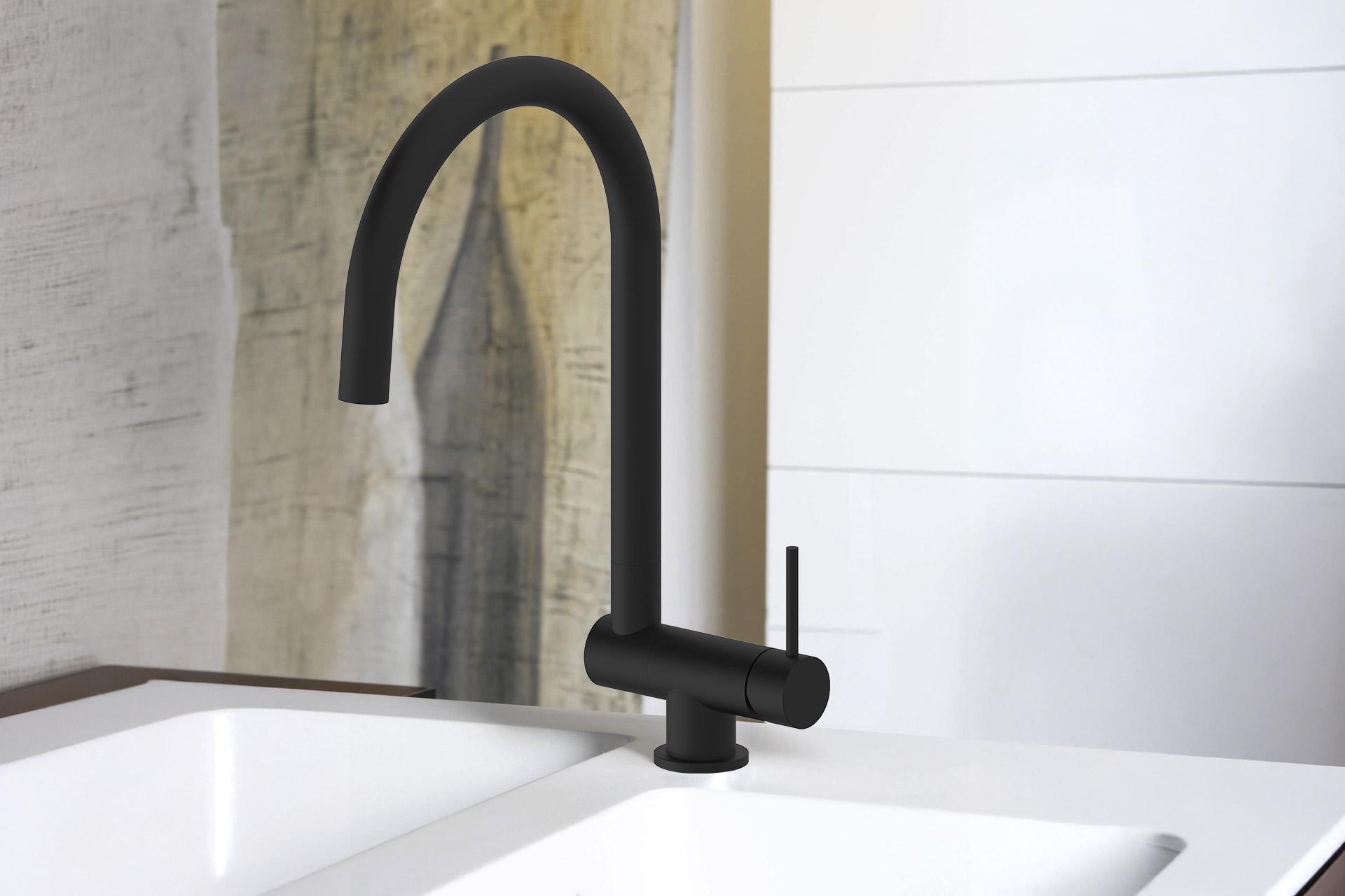 Le mitigeur CANIA est un robinet de cuisine rabattable. Son bec en forme de « canne » se bascule dans la cuve pour permettre d’ouvrir une fenêtre derrière le point d’eau. Il arbore un design fin et une finition noir mat. Grâce à son look, le CANIA est idéal pour une cuisine moderne. Retrouver ce mitigeur dans notre catalogue complet catalogue L’Univers de la cuisine.