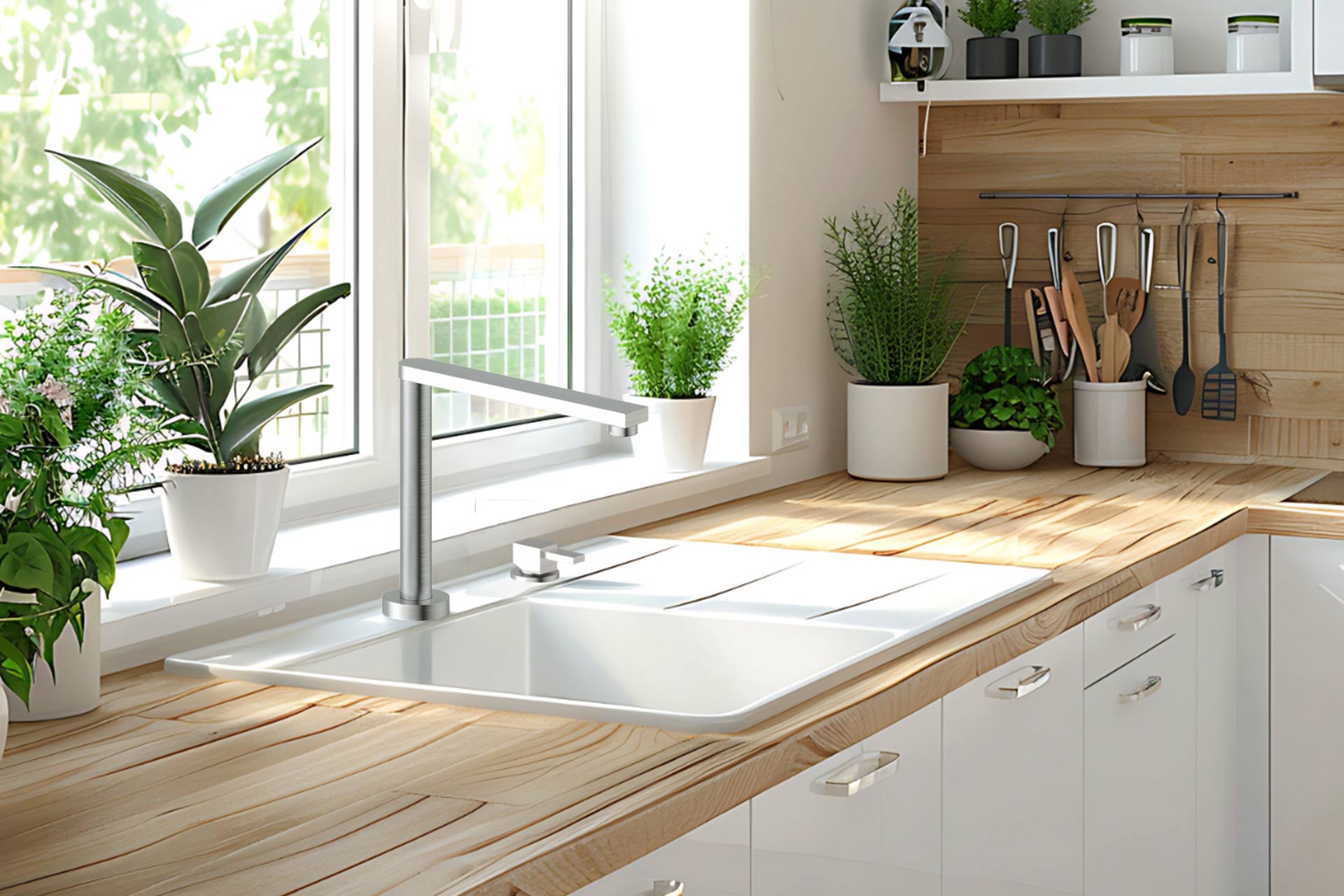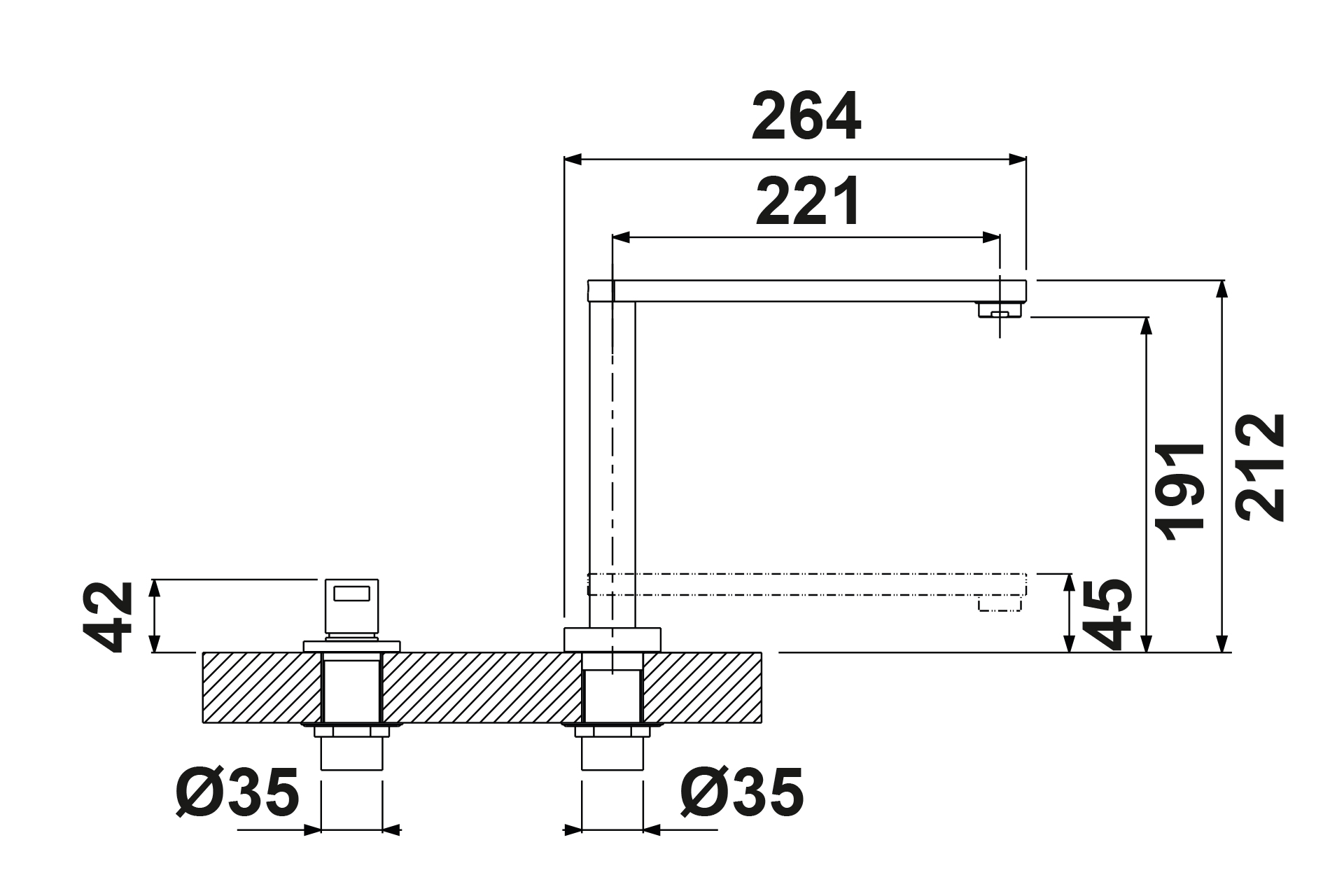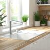 Le mitigeur GENIA2T est un robinet de cuisine pensé pour être installé devant une fenêtre. Pour dégager l’espace rapidement, le bec du mitigeur s’encastre dans le plan de travail. Ainsi, le GENIA2T est composé de deux éléments distincts : sa manette et son bec. Il faut donc faire deux trous dans le plan de travail ou sur la plage de l’évier pour l’installer. Une fois rentré dans le plan de travail le bec mesure 45 mm de haut et la manette 42 mm. Ce bec téléscopique est très utile quand la fenêtre est presque au ras du plan. Retrouver ce mitigeur dans notre catalogue complet catalogue L’Univers de la cuisine.