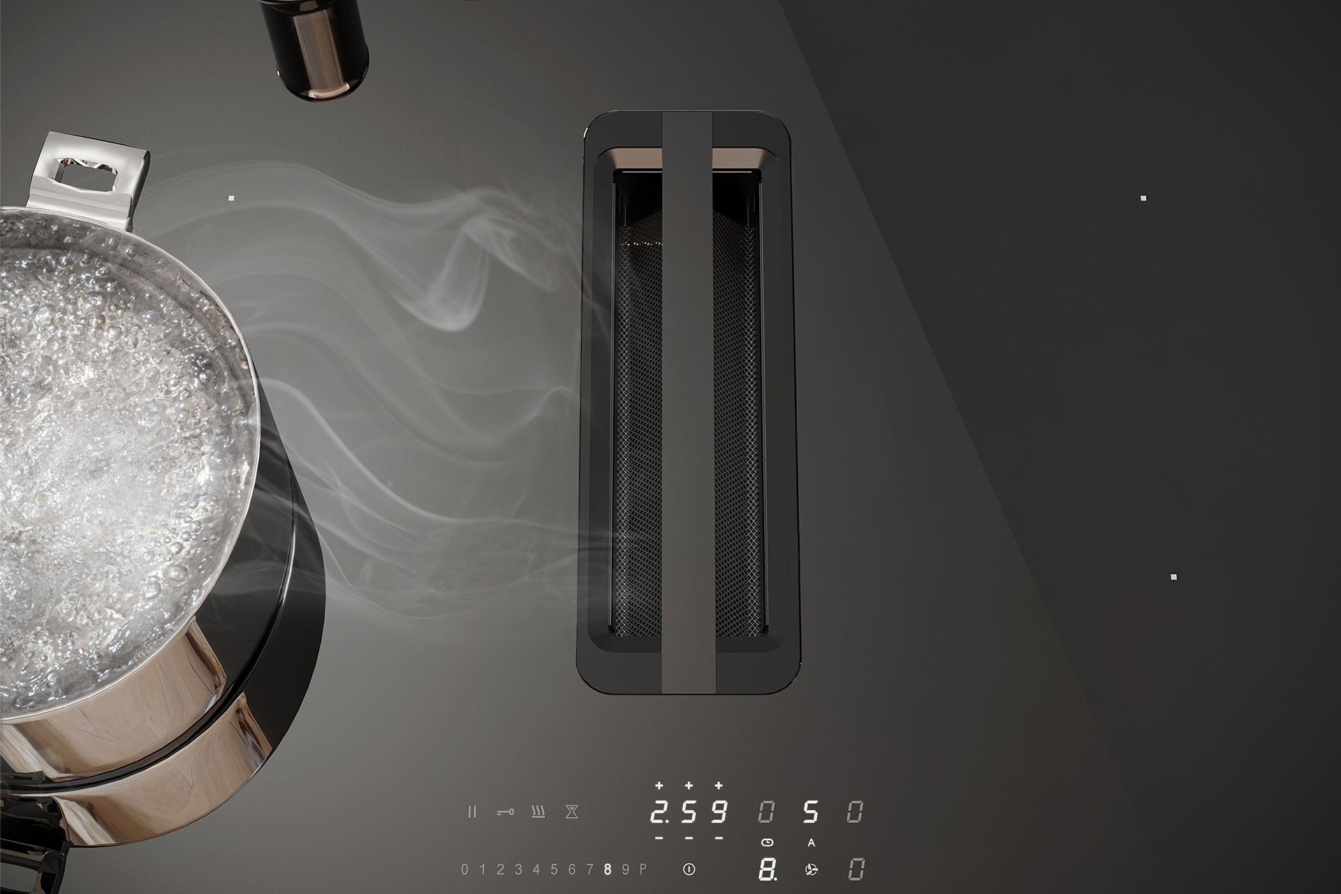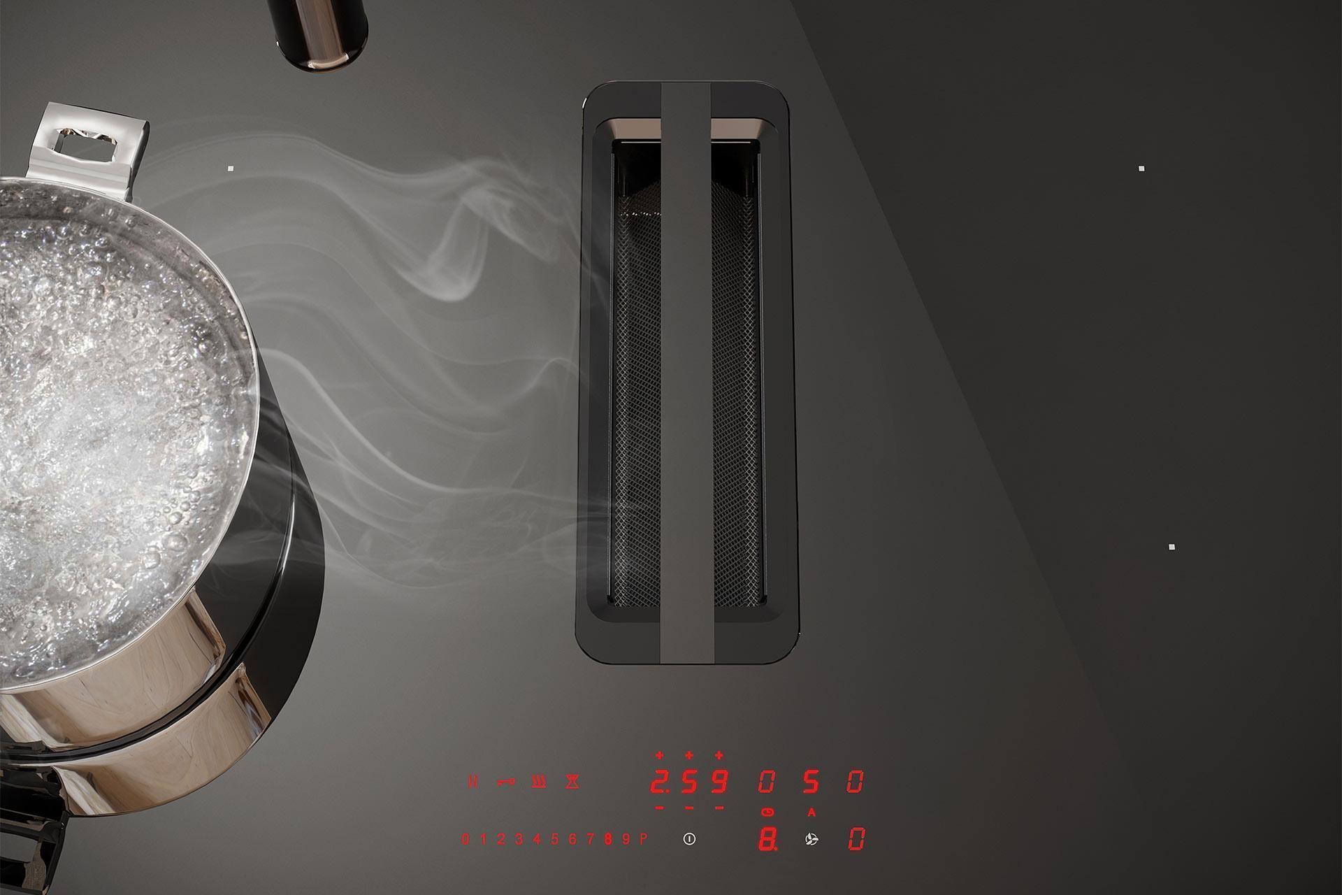 La table de cuisson aspirante 83cm TOLOMEO est fabriquée en Italie. Elle est disponible en finition LED ROUGE ou LED BLANCHE. La table TOLOMEO dispose au centre une hotte aspirante compatible avec des filtres charbons ou céramiques. Les caractéristiques de la Plaque à Induction sont : -Puissance max 7,4 kW -Voltage 2202-240 V -Fonction Boost -Fonction Pause -Détection automatique des casseroles – Maintien au chaud -Minuteur par zone et/ou la plaque de cuisson -4 zones de cuisson (2,1-3,7 kW) dont 2 bridges (4,2-7,4 kW) – Fonction verrouillage pour un nettoyage en sécurité. Les caractéristiques de la Hotte sont : -Puissance d’aspiration 620 m3/h Moteur 220 W -Niveau sonore 44 Min à 63 Max dB -Alarme filtre pour avertir de l’entretien à effectuer -Fonction active la hotte à la vitesse maximale puis réduit progressivement la vitesse -Après cuisson la hotte fonctionne pour éliminer les odeurs. Puis s’éteint automatiquement -1 Filtre à graisse lavable au lave-vaisselle -Possibilité filtre céramique ou charbon longue durée -Installation par évacuation ou recyclage. La collection de Table de cuisson TOLOMEO est à découvrir dans votre catalogue catalogue L’Univers de la cuisine.